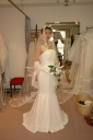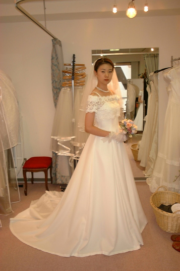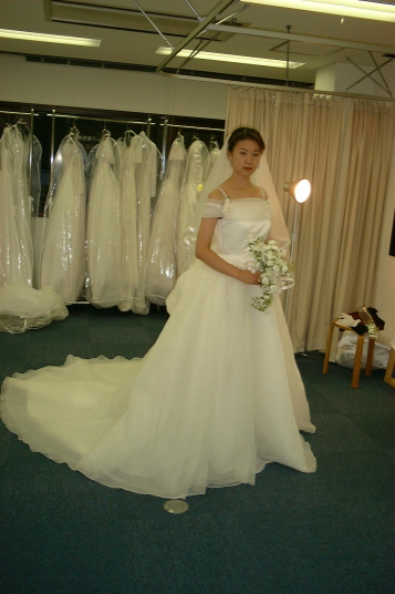 | これは似合ってる感じ(^^) 結構気に入ったよ。でも、リボンがベージュなのは・・なぜ?ウエディングだからもうちょっとフンワリして歩きずらそうなかんじのが着たいなぁ。裾を持って歩くのってお姫様っぽくて憧れない? |