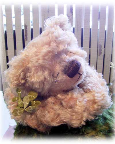 テディベアコンベンションのコンテストに参加した作品です。 クローバーの三つ葉しか見つけられず、泣きながら寝てしまったクマ君に 四つ葉を見つけたネズミ君が、一生懸命運んでるシーンを作りました。 きっと目を覚ましたクマ君は、恥ずかしそうに喜んでくれるはず..