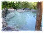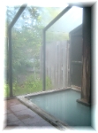 誰もいない露天風呂に入ろうとすると・・・すっごく熱い!水でぬるめながらなんとか入る。