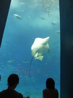 14:30 沖縄美ら海水族館。大人ひとり1800円。 巨大なジンベイザメはまだ子供で、来園10年で3mに成長!! 成魚になると10m以上になるそう。でもカワユイ顔をしている。 大水槽に面したカフェでお茶を飲みながら眺められて快適。 ※オットすでに汗だくで、Tシャツを着替える。11月だってのに!
