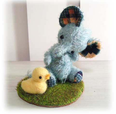 このセットは、テディベアカンパニータカシマヤ店の 夏休みお楽しみ抽選会用に制作した子たちです。 夏っぽく、水色のモヘアと、耳もブルー系のアンティークのネル生地色をで統一しました。 夏の午後、アヒルさんと芝生の上で遊んでいる仔ゾウ君です♪