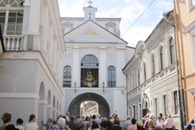 フリータイム終了後、徒歩観光を再開。旧市街の南端にある夜明けの門まで歩く。もとは9つあったという城門のうち、現存するのは、この夜明けの門だけ。門の中には、聖母イコンを祀る礼拝堂。イコンは、奇跡を起こす力があると、今でも信じられている。ヴィリニウスで唯一中世の面影を残すところといえる。夜明けの門を潜り、ヴィリニウスの台所といわれているパレス市場に向かうが、あいにく月曜日で全店休業。外から建物を眺めただけ。