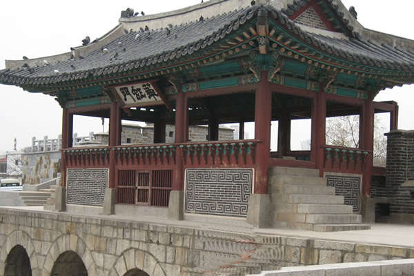 まずは水原華城。ソウル市街地から車で1時間の郊外にあり、李王朝末期に造営された。お城というより万里の長城のような城郭といった方がぴったり。全長5.5kmに及ぶ城郭と、その要所要所に門、砲台、やぐら、軍事指揮所、訓練所、休憩所などが東西南北に整然と組み込まれた機能的な軍事施設。城郭内に小川が流れており、小川と城郭が交差するところに水門が設置。水門は7連アーチ橋で、その上には華虹門という楼閣が建てられている。この水原華城、城郭の築城に石材と煉瓦を併用したことと、矢と槍を防御しつつ銃砲を撃つことができる構造が軍事的に優れていると評価されている。