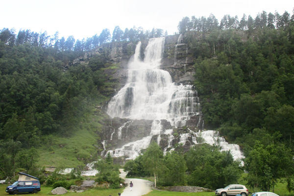8時にホテルをバスで出発。スタルハイムからノルウェー第2都市、ベルゲンに向かう。走行距離は200km。途中トイレ休憩を兼ねて滝を見るために2箇所で途中下車。30分ほど走ると1つめのツヴィンネの滝に到着。これまで見た滝と違って滝の幅がとても広く30m以上。流れ落ちる水量が豊富で、水の音と量に圧倒される。10数m近づいただけで水しぶきがかかるほどの迫力で、一同感激しながらシャッターを切る。これは必見の滝だった。