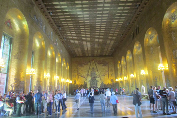 最初に訪れたのは、そのノーベル賞の晩餐会が行われるストックホルム市庁舎。ナショナル・ロマン様式の建物で、800万個の赤レンガが使われているという。30代の女性現地ガイドの案内で市庁舎内を見学。晩餐会が開かれる「青の間」、舞踏会が行われる「黄金の間」、市議会場など。「青の間」で開催される晩餐会は1,000人以上が参加する大規模なもので、メインテーブルの幅は70cm、その他のテーブルは60mという狭さに詰め込まれて食事をするらしい。