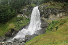 さらにバスで20分、スタインダールの滝に到着。裏見の滝とも呼ばれ、滝を裏側から眺めることができる。ツヴィンネの滝に及ばないが、山の谷間から幅20mの壮大な滝となって流れ落ちる迫力は圧巻。滝を見上げるところから緩やかな坂道の遊歩道が造られ、滝の裏側を通り抜けることができる。手が届きそうなぐらい間近に瀑布を見ることができ、滝の凄さを肌で感じられる。水しぶきがかかるのは覚悟しなければならないが、一見の価値のある滝。