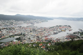 現地ガイドは、中肉中背で真っ赤なウインドブレーカーを着た中年女性。話し言葉に関西弁が混ざり、とても面白い関西のオバさん。レストラン近くの港でベルゲンの街を背景に写真撮影をしたあと、バスでフロイエン山のケーブルカーの駅に向かう。ケーブルカーで5分もすると、山頂駅に到着。標高320mの頂上からベルゲンの美しい街並みを一望できる絶好の写真スポットで、思い思いのポーズをとる。夏休みに入ったばかりで、山頂付近は観光客と行楽客で溢れている。