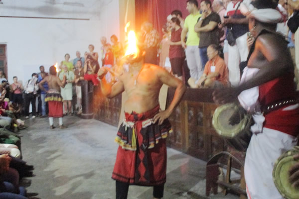 しかし火渡りの儀式だけは凄かった。この儀式は、手にした松明を振り回したり、口に含んだり、最後に焼けた炭の上を歩くというもの。人間に災いをもたらす悪魔に打ち勝つ力があるということを示すために火を食べたり、松明を身体にあてたりするらしい。何度も焼けた炭の上を歩けるのは、ダンサーがトランス状態に入っているので、熱さを感じず、火傷をしないそうだ。本当は熱くないのではないかと疑い、近寄って確かめると、間違いなく炭はパチパチ燃え盛り、近づくだけで熱さを感じた。