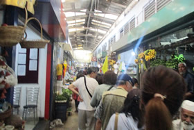 キャンディ・マーケットの前でバスを降り、マーケット内を見学。2階建ての建物の1階は、魚や肉、野菜、果物、スパイスなどの食料品。2階は、サリーや洋服、革製品、土産物などの店が並ぶ。現地ガイドの案内でひと通り見てまわったが、30℃を超える暑さにもかかわらず、魚や生肉が冷蔵庫に入れずに軒先に並べられている光景は、とても買う気にはならない。