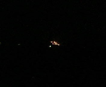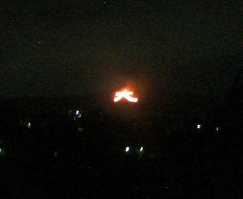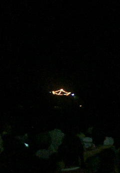 10分後、ちょっと移動すると「妙」「法」の字が見えるのですが、私のいる賀茂川の左側からでは、低い山に文字が灯っている且つ民家や大木が邪魔となって、全体を拝む事が出来ず上半分しか眺めることはできませんでした。でも、出雲路橋から「船形」も拝む事が出来ました。未だに見た事がないのは、嵯峨方面の鳥居です。京阪電鉄一本で東山の「大」が見える所まで行けるため、アッチの鳥居の方はまず向う事がないんですよね……。昔は、京都にそびえる高層ビル的な建物に、そこの人の御好意によって屋上まで上らせていただけ、全部の文字が拝められたと聞いたことあるんですがね。今の時代、そんな好意的な所はまだあるのでしょうか。来年の為に情報があれば伺いたいものですけど。 |