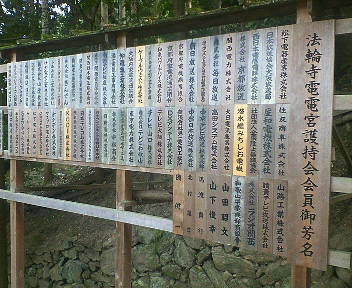 また、本殿へ向う途中に、電電宮がありました。電電宮は、その名から想像できると思いますが。電気や電波の安全を祈願するところです。鳥居のすぐ近くには、護持会会員御芳名と書かれた看板が掲げられていたのですが、眺めてみると、やはり電気や電波に関わった会社の名がずら〜っと見られました。私は以前携帯のトラブル(単に故障しただけ)に遭ってますので、同宮を見つけた際、立寄らずにはいられませんでしたよ(笑)。二度と携帯のトラブルに遭わぬよう、同時に電気・電波のトラブルに遭わぬよう、少々の賽銭を納めて祈願させていただきました。