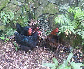 余談ですが、同神社内には何故か鶏がいたのです。茶色の鶏一羽に黒色の鶏三羽が放し飼い状態で。動物に慣れた友人N氏は早速鶏四羽に近づいていきました。右側の写真の撮影後、写真左方よりN氏が鶏四羽とおたわむれ(?)のひと時をお過ごしになられました。N氏によれば、TVの番組で、鶏をあり得ない向きに体を曲げてやると全く身動きしなくなると言ってた、といい、さっそく実践されていたのです。すると四匹ともピクリとも動かなくなったのです!それを見た管理人、あまりの動かなさに驚き、N氏に元に戻すよう促し、N氏は了解して元の体に戻し、元に戻った鶏は何事もなかったかのような顔つき(?)で境内を歩き回っていました。しばらく見守ること数秒後、再度N氏が近づいて鶏とおたわむれのひと時をお楽しみに……以下省略(笑)。何故この神社に鶏がいるのか原因は不明でしたが、このことがきっかけで我々は同神社の事を鶏神社と呼ぶことになりそうです………神様、スイマセンm(_ _)m ちなみに、神社を出た後のN氏の顔は、いつも以上に満喫しきった顔つきをされていましたとさ(笑)。