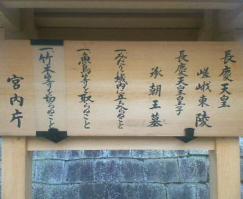 他にも、京福嵐山駅すぐ近くに、美空ひばり記念館があったのですが、もう時間がなかったので入館はしませんでしたけど。また、嵐山界隈から少し歩いた閑静な住宅地の中に安倍清明の墓がありました。清明といえば、近年ブームだった陰陽師で有名な人物であり、堀川一条付近にある清明神社も人気の観光スポットのようです。まさか、こんな所に墓があるとは…… 日も暮れてきたので、この日最後の〆として訪れたのは、最近よくご縁のある(というより見かけたらつい見物に行ってしまう)天皇陵であります。清明の墓からすぐ近くの所にあったその天皇陵、陵の主は第98代長慶天皇、そして隣にはその皇子承朝王の墓も並立してました。