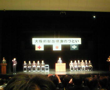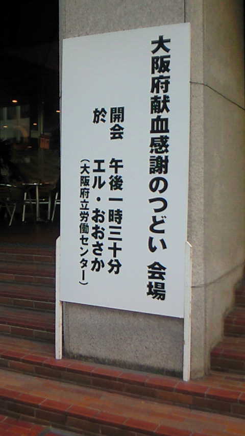 今日は、献血の表彰式「大阪府献血感謝のつどい」があったので、式に出席しました。だいたい月一度のペースで私は献血に勤しんでいるのですが、今春に献血回数が70回を超えたので、表彰していただけることになったのです。てっきり休日かと思っていたのですが、思いっきり平日昼間でした。やはり公務員ぽい、休日にはやらんのかいな…とちょっと思いました。 会場に入ると、思った以上に人が居ました。70回以上の献血(累計100回、200回など)の方もいますし、献血活動が十数年以上になる推進者・団体などもいます。今回欠席した人も居るでしょう、全て入れると千人以上になるでしょう。 ざっと見回してみると、多少想像していたとおり、割と若年層は少なかったです。若い人の献血離れも影響しているのか、と思うのは考えすぎなのか……