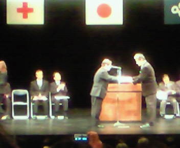 その後、挨拶・祝辞、来賓・主催者紹介の後、いよいよ表彰が始まりました。 これだけの人数ですから、一人一人に表彰状等を手渡すのは時間がかかりすぎるので、代表者一人が舞台上で受取ります。各個人に渡される賞状は、既にあらかじめ各座席(因みに指定席)に記念品などと一緒に袋に入れて置いてありました。形はどうであれ、表彰してもらえるというのは、嬉しいものです。そんなにいただける機会なんてありませんし。