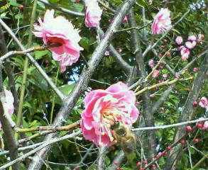 JR大坂城公園駅を下車し大坂城ホール前を通過して青屋門から入場。ふと左手に目をやると、梅林が広がっています。伺ったときには、ちょうど赤色や白色の花が咲いておられます。各所でその綺麗な花を狙ったカメラマンたちがあちこちでシャッターを押しています。不肖管理人、花に関してはとんと疎い所があるのですが、あまりに写真を撮る観光者たちの多さにつられて混ざって梅の花の写真を撮ってしまいました。 そのうち一番写りのええモノを載せております。たまたま撮影時に花粉を頂戴している蜜蜂を発見したので、花粉採取時を狙ってシャッターを押しまくりました。