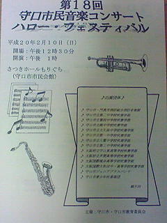 私の生誕地である大阪府守口市で守口市民音楽コンサート「第18回ハローフェスティバル」が、さつきホールもりぐち(守口市市民会館)で催されましたので、今年も聴きに行ってきました。以前守口市民だった頃は毎年音楽を聴きに行っていましたけど、転居してからはとんと行かなくなりましたが、近年復活(?)して暇があったら聴きに行くようになりました。簡単に説明すると、出演団体である、守口市内の中学・高校の吹奏楽部と市の吹奏楽団・消防音楽隊が、同市市民会館「さつきホール」という所で演奏するのです。勿論、私の住む寝屋川市でも同様のコンサートがあります(「ブラスの響き」)し、他の市でも同様のコンサートは恐らくあるでしょう。 司会・進行は地元にあるFMもりぐちこと“FM HANAKO”(FM82.4)から三宅さんて人がいらっしゃってました。会場を見渡すと、北河内地区で放映されている、ケーブルテレビらしきテレビカメラも見受けられました。ひょっとしたら管理人の顔も映ってしまっているのでしょうか…(汗) |