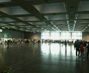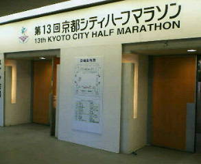 京阪三条駅から歩くこと約15分、「みやこめっせ」到着。すぐ近所に平安神宮、岡崎公園、京都会館などがあります。koji氏の付添いとして受付会場にも足を運んでみました。1階で受付後、3階へ行くと、イベント会場が広がっていました。本大会協賛企業などが並んでいて、ユニフォームやシューズ、サングラスなどのスポーツ用品やグッズが販売されていました。他にも健康度チェックや京菓子の販売もされています。会場正面に飾られた大画面には、実行委員や関連企業のお偉い方がコメントしているビデオが流れてました。大会に参加するには事前登録が必要ですが、大会前日や前々日に催される各種イベントには自由に参加が可能のようです。残念ながら、有名選手は見かけなかったのですが、スポーツグッズ売場の所には高橋尚子を始めとした有名選手のサイン入りスポーツ用品が展示されていました。あまりに人が多くて写真撮れなかった……