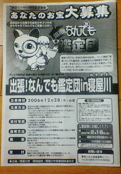 今日朝にポストを見ると、こんな白黒のチラシが入っていました(左写真参照)。そうです、あのテレビ大阪で放送されてる「開運!なんでも鑑定団」が私の地元に出張鑑定でやってくるらしいのです!こりゃビックリニュースですよ。チラシをよく読んでみると、どうやら我が地元は市制55周年の記念事業として、当番組の出張鑑定の公開録画の予定をしているそうな。歴史好きな管理人は都合がつけば見てるので、ある日テレビをつけたら、ええっ自分の地元が映ってるやんけ〜的な気分(?)に浸ってみたいですね。公開録画開催日は来年2月18日(予定)!…うへぇ、めっちゃ行きてえ〜(;´Д`) このチラシを見た管理人、早速お宝になりそうなモノを探して見ますが、なかなかありません。百歩譲ってそれっぽいものを出すとすれば、大昔に家紋の入った漆塗りっぽい器があったらしいのですが、残念にも今はどこへいったのやらわかりません…。 お宝はありませんけど、公開録画は見に行きたいですねえ。何気なく見に行ったら友人・知人が物を持って出演してたら、もうビックリものですねぇ。こりゃ当日が楽しみだ〜♪ |