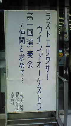 友人マキハラ氏が、何処から見つけてきたのか、今日ブラスバンドの演奏会が守口であるとの情報を教えてくれたので、友人N氏と行って見ました。肝心のマキハラ氏は家の都合で来なかったですが。バンド名は「ラストエリクサーウィンドオーケストラ(LEWO)」といい、京阪守口市駅前すぐの守口文化センター(エナジーホール)という所で、第一回演奏会を開催してたのです。因みに、エナジーホールの地下には、“FM HANAKO”(FM82.4)のスタジオがあるんです。 さて、我々が興味を引いたのは、ずばり曲目。ゲームミュージックのみの演奏。マリオやDQ、FF等々…懐かしいゲームサウンドの演奏、こういうバンドの出現を待ってましたよ(笑)