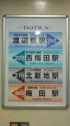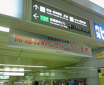 中之島線渡辺橋駅から北へ少し歩いたところにある、堂島地下街では、京阪中之島線の開通を歓迎する幕が見られました。この写真では見づらいな…管理人、撮影下手くそだな(泣)堂島からの最寄り駅の距離が書かれた看板もありましたが、これを見ると、意外にも堂島から然程遠くないんですね。 堂島へはたまに来ますが、今まで以上に通いやすくなりそうです。 |