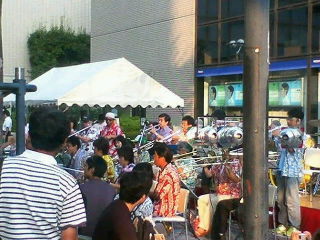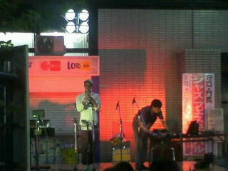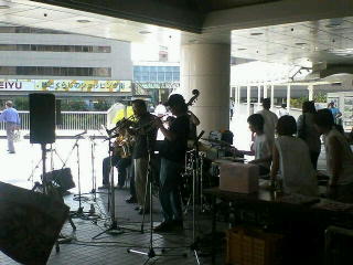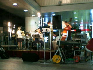 「テルミン児嶋agic」というグループがテルミン演奏するのですが、よくよくプログラムを見てみるともう集合前に終了していたことが発覚!…しまった遅かった!聴けなかったことを悔みながら、とりあえず駅前周辺をぐるぐる回って聴きまわる事に決定し、あちこち聴き回ったあと最後は京阪百貨店横エナジーホール前カナディアンスクエアという広場で最終の19時くらいまで聞いてました。一番最後に聞いたのは「プラネタリウム」ていう外国人2人によるグループなのですが、ジャズとは一風変わったコンピュータ音楽を用いた新しい音楽を演奏してました。コンピュータ音楽として関東某駅構内アナウンスや飛行機内外国語アナウンスなども音楽の一種として利用しており、それがまた印象的でした。彼等は今開催中の愛知万博ででも演奏していたそうです。ちなみに。