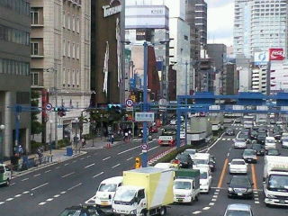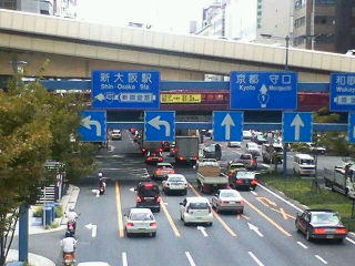 休日だったので、久々に朝から独り“歩行会”をやってみました。“歩行会”なるものは結構前にも記載しましたが、正式な会でなく単に友人らと遊び半分で始めた若気のいたり(?)みたいなもんです。今回のターゲットは我が故郷守口から国道1号線を並行し大阪梅田までを歩いてみました。守口から梅田へ行く道は幾つもあるのですが、今回はたとえ細くて近道があったとしてもソコは通らず、ひたすら1号線に沿って歩き通すものとしました。…まあ、正直な話、特に何の役にも立たないんですが、やる事に意義があるという事で(笑)守口市京阪本通2丁目にある守口市役所前(写真左)を起点とし、いざ出発!地下には大阪市営地下鉄谷町線守口駅がありますが、あえて乗車せずにその上の国道1号線を黙々と歩いていきます。約8キロ超の小さな旅の始まりです。道中の京阪本通1交差点ではの大阪市営地下鉄8号線の工事がまだまだ続いています。地下鉄8号線はその一部が大阪内環状線(国道479号線)に沿って走る8番目の地下鉄で、上新庄から今里まで走るようです。そんな工事をよそ目にどんどん進んでいきます。空は多少曇天気味でしたが、雨なぞ何のそのです。 歩き初めて約45分後、関目5交差点(写真右)に到着です。この地下には大阪市営地下鉄谷町線関目駅があります。1号線は南北に走っており、同交差点を起点として真東には四条畷市や相楽郡木津町を走る国道163号線があります。西には都島本通が走っています。西進して歩いた方が梅田へ早く到着できるのですが、初志貫徹、自分は1号線と共にあり(?)という事で休むことなく1号線を南下します。ここから南へもあの工事中の地下鉄8号線が走る予定なので歩いていると工事関係者がチラチラ見れます。めげずに黙々と歩いてゆきます。そして更に約30分ほど歩くと京阪京橋駅が建物の間からチラ見できました。京橋駅前でぶらつくのも有りでしたが、そんな事には目もくれずにひたすら国道1号線を歩んでいきます。道中では道に迷った女性に道案内したりするなど、実は善意者ですねん的アピール(?)も忘れません。 旧淀川である大川に架かる桜宮橋を渡ると、向かって左手に大阪造幣局があります。桜の季節には名前が出るあの造幣局です。入口には怖い顔した警備員がおり、その殿方を横目にスタスタ歩いてゆきます。関目5交差点から約45分後に東天満交差点に到着です。ちなみに写真左は造幣局付近から同交差点を向いて撮影したものです。ここから真南へ向かえば天満橋があります。逆に、北へ向かえば源八橋が現れ渡ればJR桜ノ宮駅に到着できます。ここまで来ればもう梅田は目と鼻の先みたいなもんです。 更に西進すること約8分、天神橋2交差点が見えました。この交差点の南北が天神橋筋商店街であり、各店舗が軒を連ねています。この地下には地下鉄谷町・堺筋線南森町駅+JR大阪天満宮駅があります。同交差点から南南東方面すぐのところに、天神祭でお馴染みの大阪天満宮が御座います。「打〜ちましょ(パンパン)、もひとつせ(パンパン)、祝うて三度(パパンがパン)」という掛け声が祭には聴けます。天神祭の頃はこの付近は人・人・人の人だかりでみまわれ、特に商店街はかなりの混雑になります。いつもならチラッと訪問するのですが、今回は天満宮に寄り道をせずひたすら梅田を目指して休む事なく歩き続けます。
